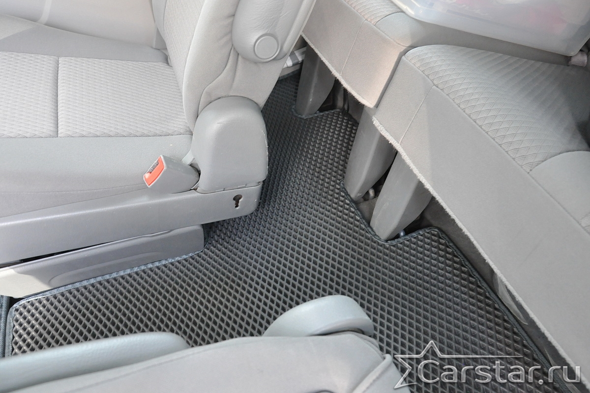 Автомобильные коврики EVA Dodge Grand Caravan V (2007-2020) 2 ряд: кресла 2+1 без прохода – это долговечные, удобные и универсальные аксессуары, которые помогут надежно защитить салон и багажник вашего авто от пыли, грязи и влаги в любое время года.